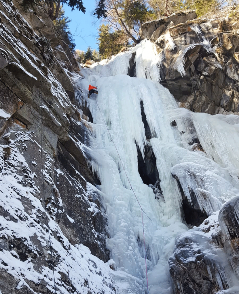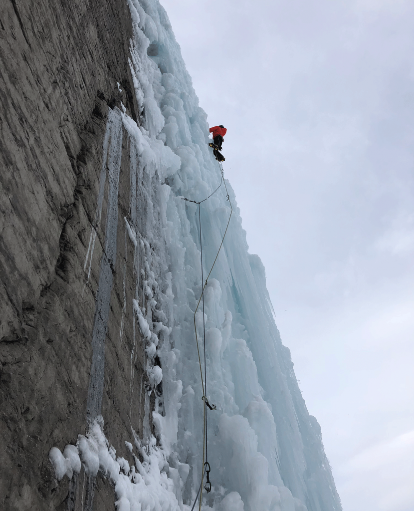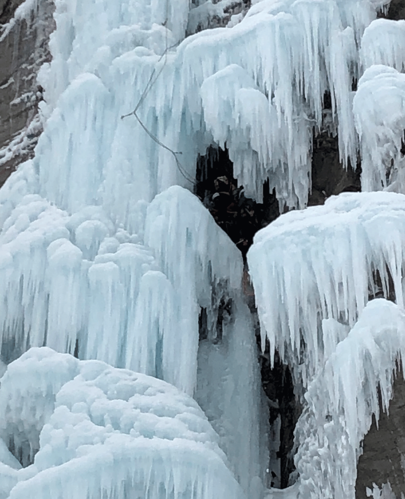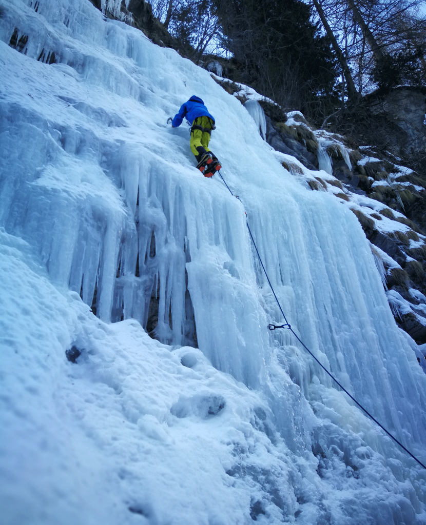 Nicht zu vergessen die richtige Ausrüstung, scharf geschliffene Eisschrauben, Steigeisen und Eispickel.