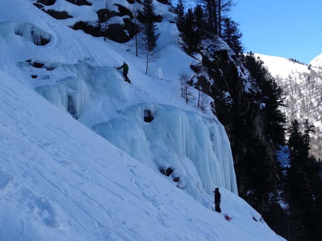 Um später auch längere Eistouren klettern zu können, ist eine richtige Sicherungstechnik Voraussetzung und auch das selbstständige Abseilen muss gekonnt sein.
