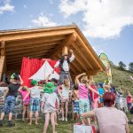 We liepen naar de lange tafels waar het eten opstond. Er waren groente pakketjes, fruit, chips, popcorn, en deeg om “Schlangenbrot” te maken. Wij Nederlanders kennen dat woord niet. Zoë vond het heel erg leuk om haar eigen brood te bakken boven het vuur. Het duurde haar wel iets te lang, dus liet ze mij achter met het broodje, om lekker met het water te spelen. Naast ons was de ‘wasserbahn’ hoe Zoë het noemt. Dat begint helemaal bovenaan bij Leisee, en stroomt naar beneden. Erg leuk voor de kids om mee te spelen. Ook Demi was erg onder de indruk van het brood, wat eerst alleen maar deeg was. Nadat we wat gegeten en gedronken hadden wou Zoë graag als piraat op de foto. Terwijl we met z’n drietjes naar de plek liepen waar dat gedaan werd, kwamen we Wolli tegen! Zoë knuffelde hem meteen. Samen met een paar andere kinderen. Demi was een beetje bang, en bleef veilig bij mama.